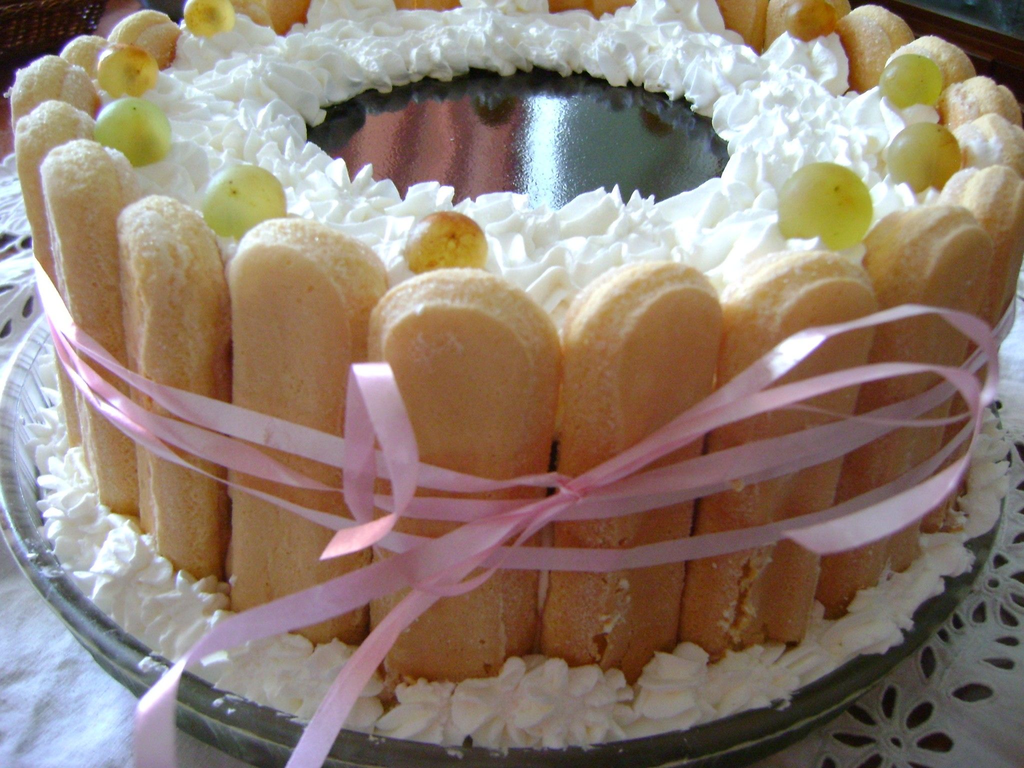 Blat biscuiti ladyfingers, crema de mascarpone, fructe de sezon, jelee de cafea cu rom, frisca. Minim 1,5 kg/sarlota.