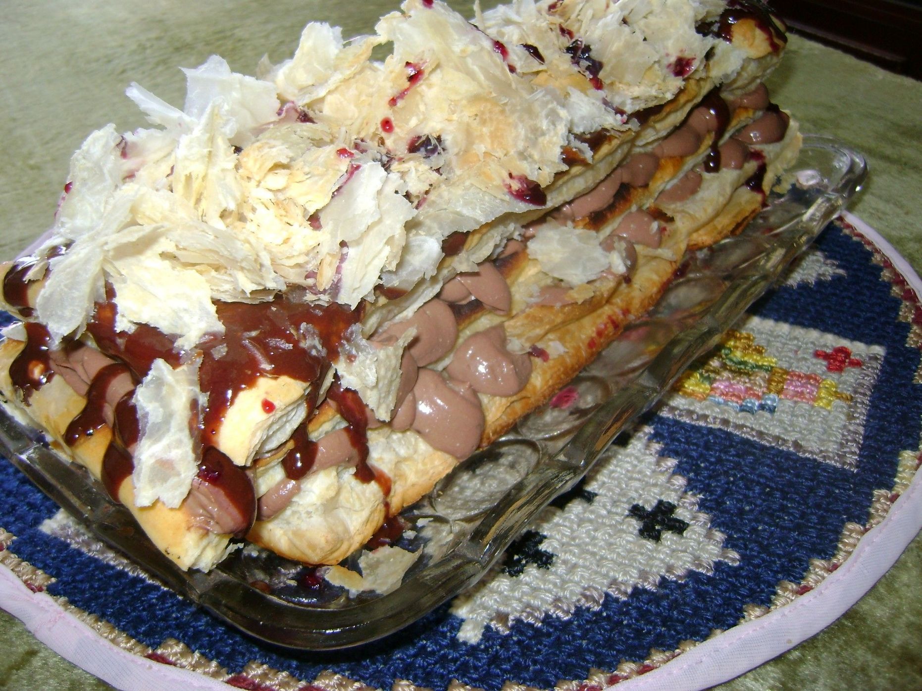 Blat de foitaj, crema de ciocolata cu frisca, coulis de afine. Minim 1,5kg/prajitura.
